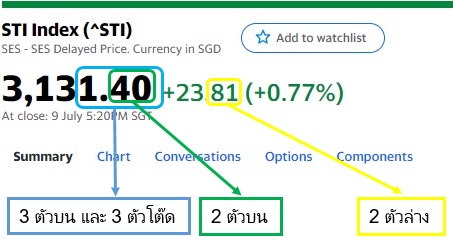ใช้ผลดัชนีการปิดตลาดหุ้นของสิงคโปร์ ชื่อหุ้นSTI (Straits Times Index) มาออกผลรางวัล โดยการนำเลขหลักหน่วยและจุดทศนิยมทั้งสองหลักของค่าValue มาออกรางวัล3ตัวบน และใช้จุดทศนิยมหลักหน่วยและหลักสิบของค่าValue มาออกรางวัล2ตัวบน และใช้จุดทศนิยมหลักหน่วยและหลักสิบของค่าChangeมาออกรางวัล2ตัวล่าง